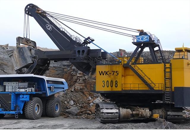 以太原重工生产的WK75型矿用挖掘机为例,其铲斗容量高达75立方米,整机重量接近2000吨,一小时就可以采矿上万吨。与之配套的中型挖掘机WK35型,标准斗容也有35立方米,额定载荷为65吨,专为与172吨至326吨级的自卸车进行配套作业,只需四五下就可以把一自卸车的车斗装满。